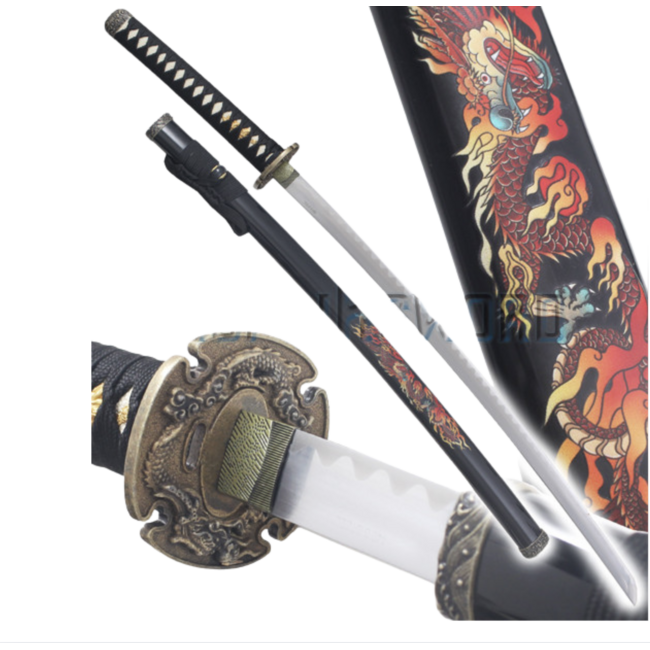 Deze katana combineert een klassiek gebogen lemmet met verfijnde details en een opvallend drakenmotief. De afwerking van het handvat en de schede zorgen voor een authentieke uitstraling, waardoor het zwaard direct in het oog springt.